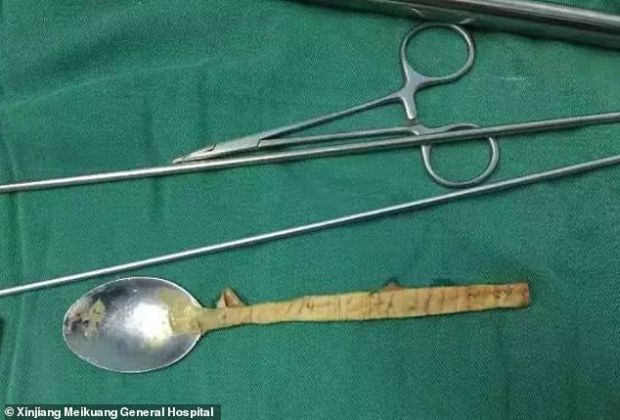 Warga China dari wilayah Xinjiang itu memberitahu doktor bahawa dia menelan sudu besi dalam satu taruhan pengambilan minuman keras.