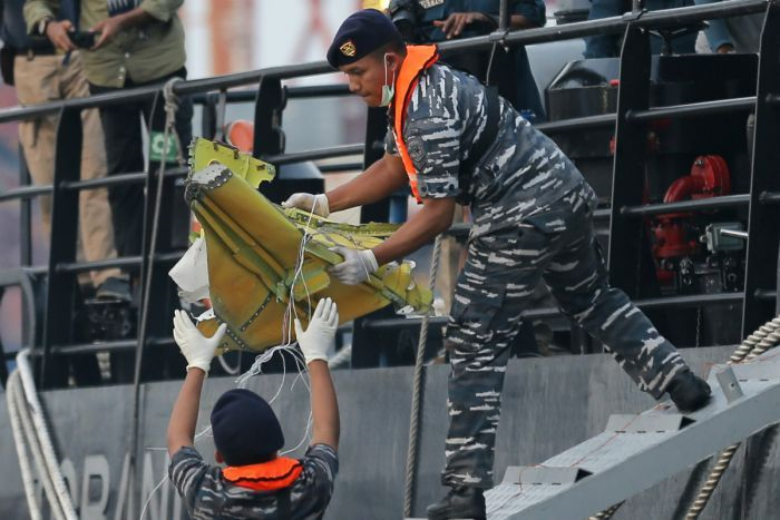 Anggota Tentera Laut mengangkat sebahagian serpihan pesawat yang ditemui.