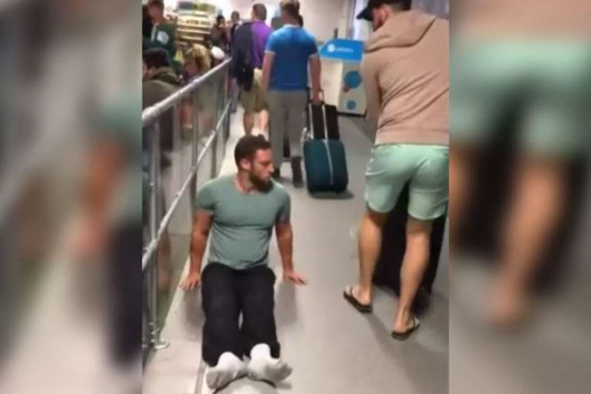 Rakaman menunjukkan Justin Levene, dari utara London, bergelut untuk bergerak menggunakan tangannya di lapangan terbang, sementara penumpang lain hanya melihatnya.
