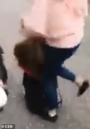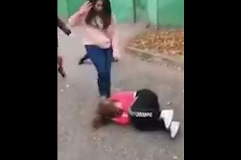 Seorang lagi pelajar berusia 13 tahun dikenali sebagai Polina Duchkova dilihat melompat dan memijak bahagian belakang kepala mangsa.