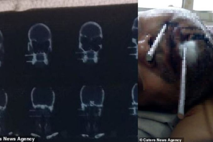 Sepasukan doktor melakukan pembedahan selama empat jam untuk mengeluarkan lembing itu daripada wajahya. - Daily Mail