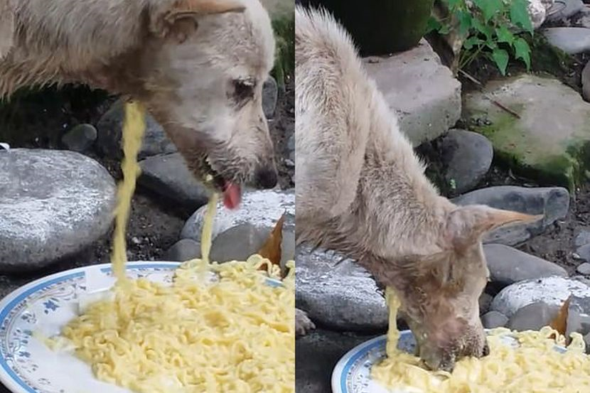 SITUASI memilukan seekor anjing liar yang cuba memakan sisa mi yang ditinggalkan oleh seorang penduduk mampu meruntun hati sesiapa yang melihatnya.