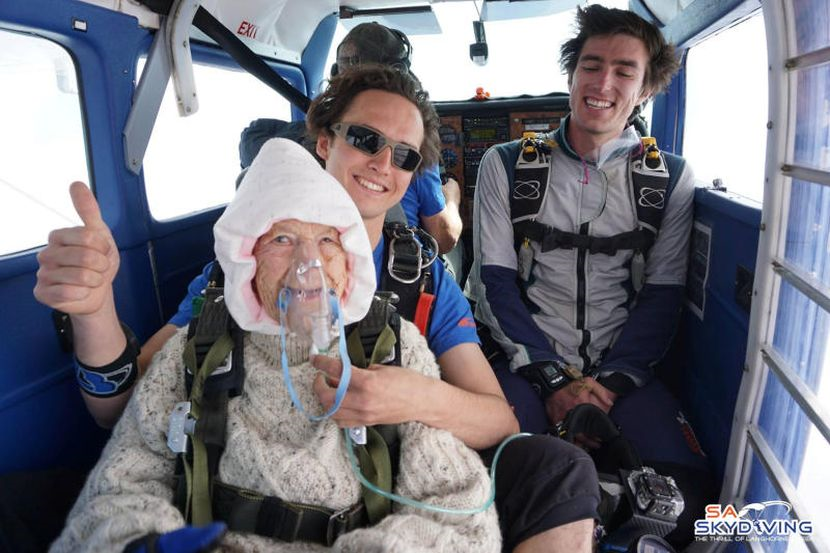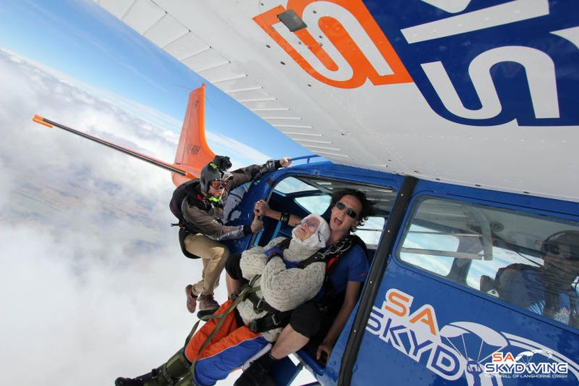 SA Skydiving di Adelaide mengucapkan tahniah kepada warga emas itu di atas pencapaiannya selepas dia terjun bersama seorang pengajar, Jed Smith.