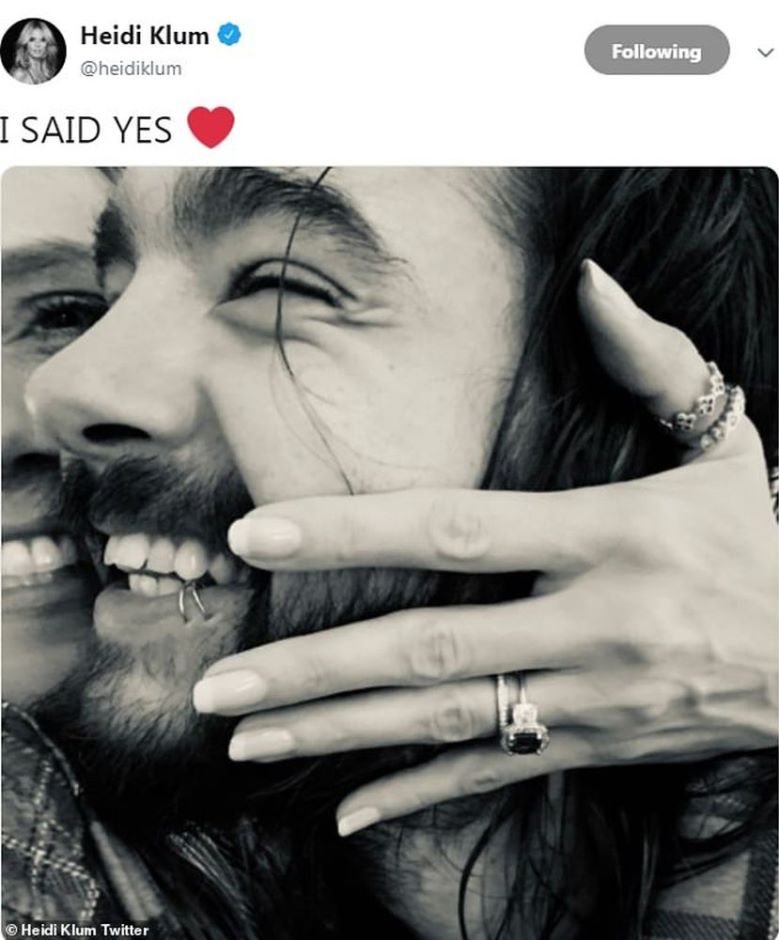 Heidi menunjukkan cincin pertunangannya. Foto Twitter Heidi Klum