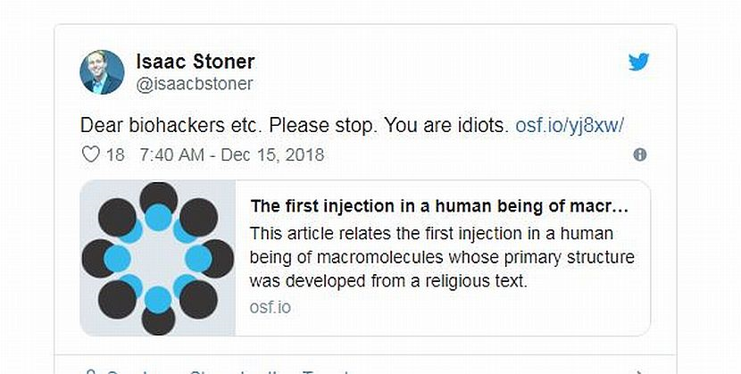 "Kepada semua 'bio-hackers' dan sebagainya. Sila berhenti. Anda bodoh," kata pengasas sebuah syarikat yang meneliti ketahanan antibiotik, Isaac Stoner di Twitter yang menghubungkannya dengan kisah eksperimen Locatelli.