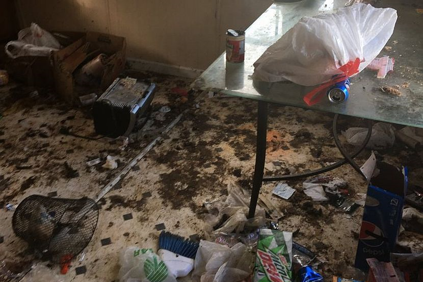 Pakaian kotor ditimbun pada perabot di ruang tamu yang juga penuh dengan najis, menurut penyiasat.