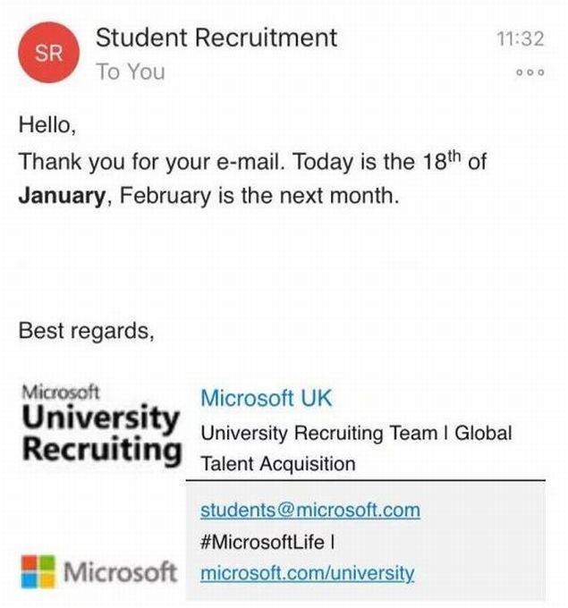 Bingung menunggu, dia menghantar emel kepada Microsoft, yang kemudian memberitahunya bahawa tarikh temuduga itu adalah pada 18 Februari.