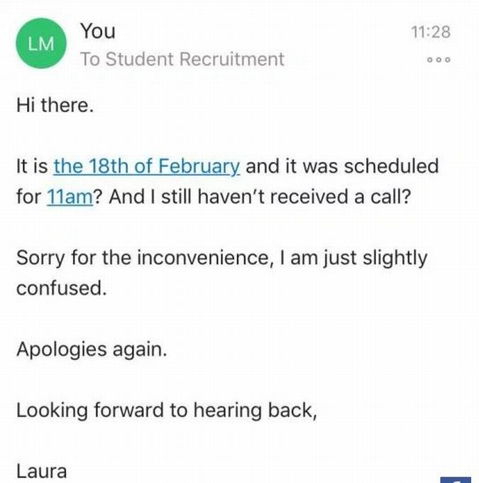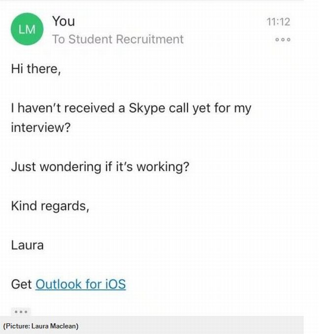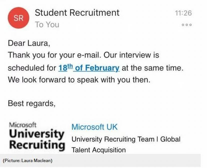 Baru-baru ini, Laura Maclean membuat posting di Twitter, memaparkan beberapa emel antara dirinya dan wakil di Microsoft yang membincangkan tentang tarikh temuduga pekerjaan baharunya yang dijadualkan dibuat melalui Skype.