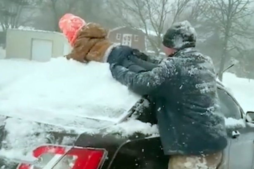 SEORANG lelaki dirakamkan menggunakan seorang kanak-kanak sebagai alat untuk membersihkan salji yang memenuhi keretanya.