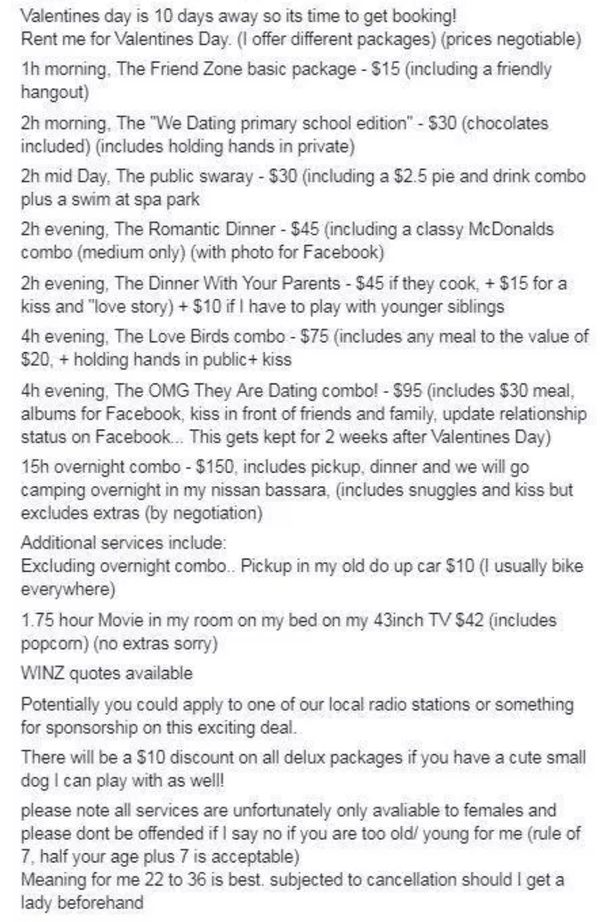 Peter mengiklankan tawaran itu di laman Facebook Taupo Noticeboard dengan lapan pilihan pakej yang boleh dibeli oleh wanita yang berminat.