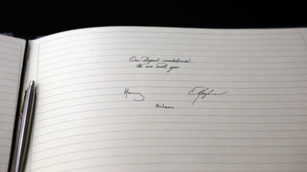 Pasangan diraja Britain itu antara golongan kenamaan terawal menandatangani buku ucapan takziah itu sejak pejabat berkenaan membukannya untuk kehadiran pelawat.