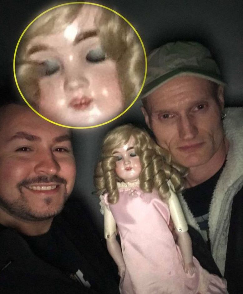 Dua penyiasat paranormal bersama dengan anak patung Janet dengan matanya tiba-tiba tertutup. Foto Craig Jones/Caters News Agency