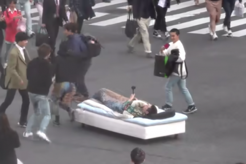 SEKUMPULAN lelaki menarik perhatian ramai apabila dengan selamba berbaring atas tilam yang diletakkan di kawasan lintasan Shibuya di Tokyo. Gelagat mereka kemudiannya dimuat naik menerusi YouTube dan Twitter yang sekali gus menyebabkan ia tular. Video yang dimuat naik pada 28 Mac menerusi akaun Twitter @joeANDdream menunjukkan seorang lelaki berbaring atas tilam yang diusung empat lelaki. Sebaik lampu isyarat bertukar merah, mereka segera mengusung tilam itu dan meletakkannya di tengah lintasan yang sibuk itu. Pejalan kaki dilihat merakam gambar dan video gelagat kumpulan itu. Hanya beberapa saat sebelum lampu isyarat bertukar hijau, empat lelaki itu segera mengangkat tilam itu dan berlari melintasi laluan itu. Bagaimanapun, tindakan kumpulan lima lelaki ini menyebabkan mereka berdepan tindakan undang-undang kerana melanggar peraturan lalu lintas. Setiap hari ketika waktu puncak, lintasan Shibuya digunakan lebih 3,000 orang. -JapanToday