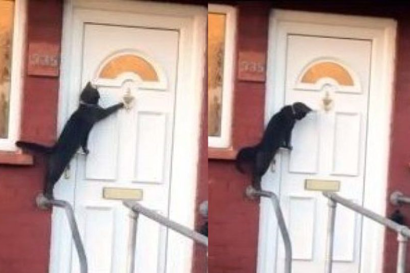 Menerusi video tersebut, kucing itu cuba mencapai gelung pengetuk pintu dan biarkannya selama beberapa minit sebelum menunggu pemilik rumah membuka pintu berkenaan.