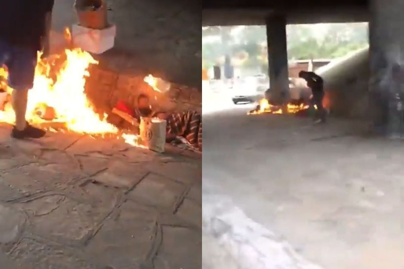 Menerusi satu rakaman tular, lelaki itu menyimbah cecair keatas dua lelaki gelandangan yang tidur di bawah jambatan.