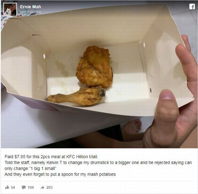 "Minta staf, iaitu Kelvin T untuk tukar ayam paha kepada yang lebih besar," tulisnya.