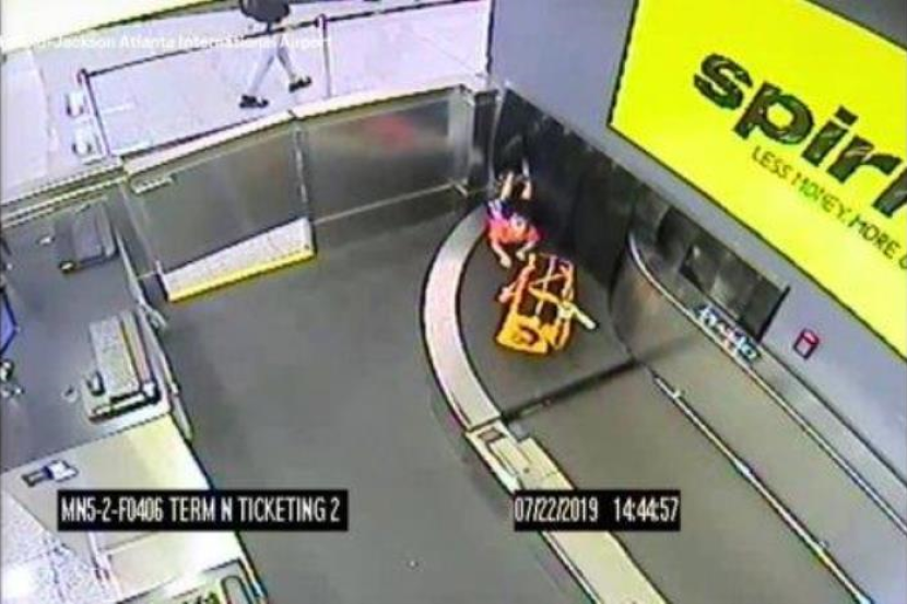 Lorenzo dilihat cuba berpaut pada sebuah bagasi yang sedang berpusing untuk diperiksa.