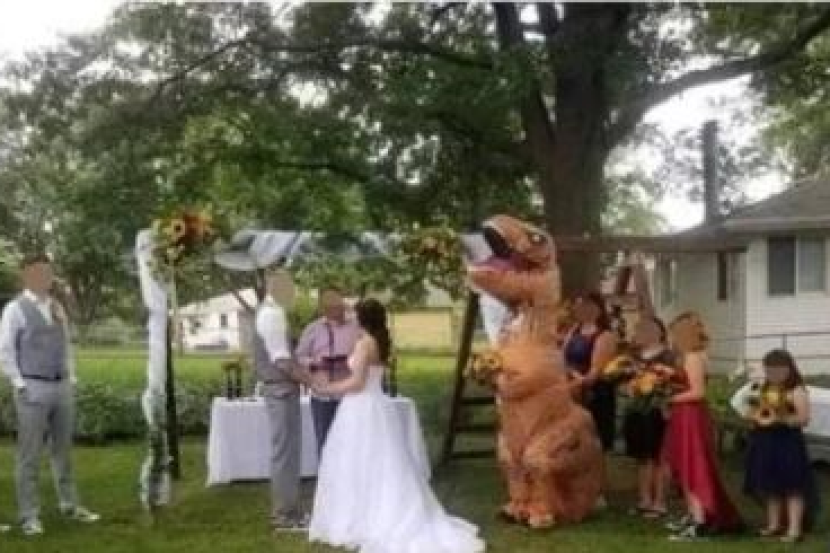 Seorang rakan kepada pengantin yang dilantik sebagai pengapit menampilkan kelainan dengan menggenakan kostum dinosaur.