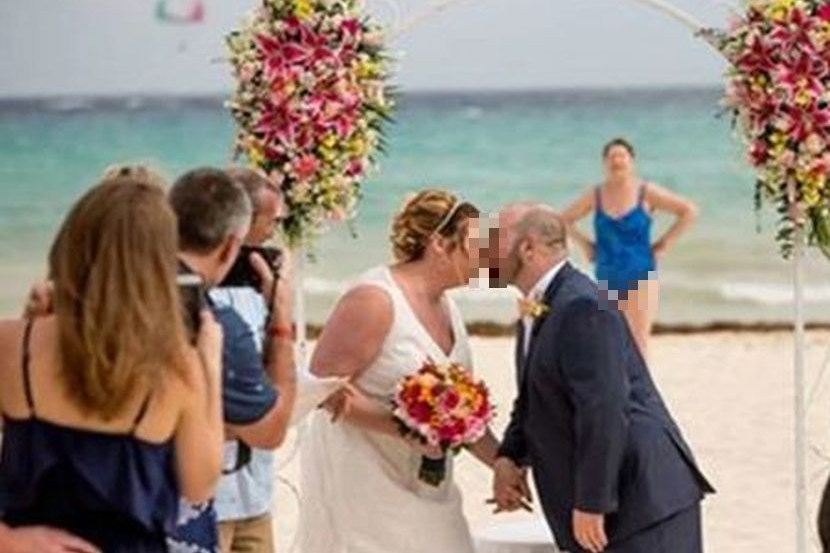 SATU pasangan pengantin yang berkahwin di tepi pantai dikejutkan dengan kemunculan seorang wanita berbikini.