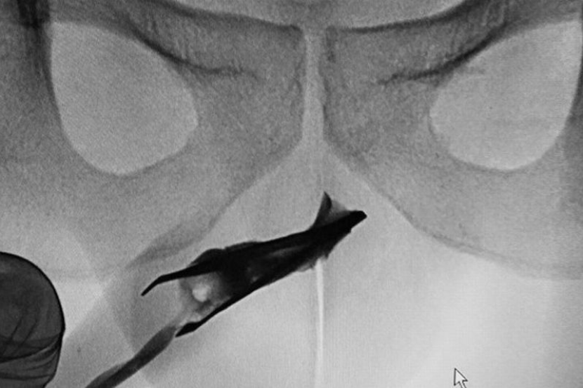 Imbasan x-ray mendedahkan di mana letaknya pengepit itu, yang menunjukkan bahagian hujungnya dalam keadaan mengepit tertanam dalam bahagian atas urethra.