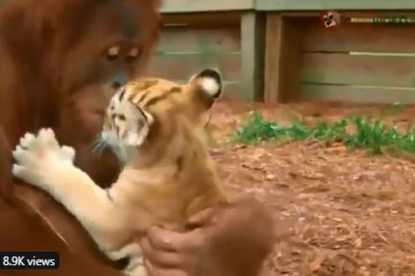 Video itu menunjukkan orang utan itu menyuap susu botol ke mulut salah seekor anak harimau berkenaan.