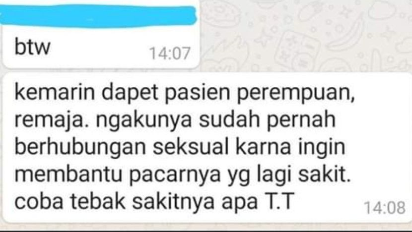 "Semalam dapat pesakit perempuan, remaja. Dia mengaku sudah pernah melakukan hubungan seksual kerana mahu membantu teman lelakinya yang sakit. Cuba teka apa sakitnya?