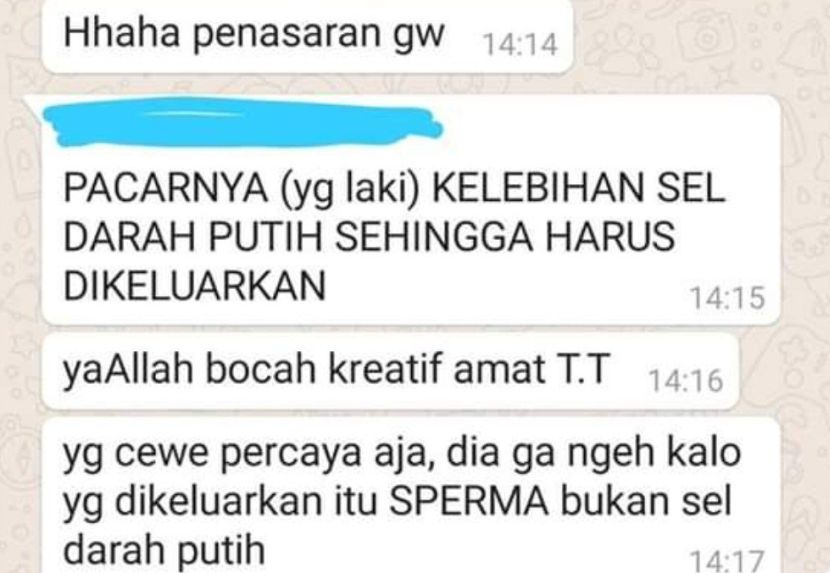 "Teman lelakinya mempunyai lebihan sel darah putih sehingga ia harus dikeluarkan. Si teman wanita percaya saja, dia tak tahu yang dikeluarkan itu sperma, bukan sel darah putih," demikian perkongsian melalui posting tersebut.