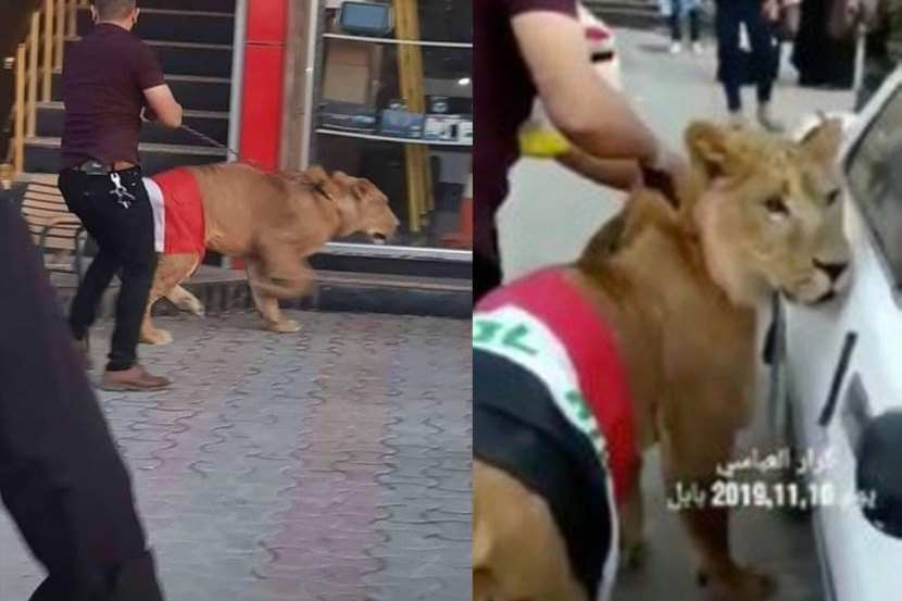 SEORANG penunjuk perasaan dirakam membawa seekor singa yang dirantai dalam satu demonstrasi jalanan di Baghdad.