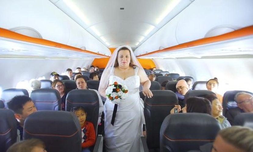 Cathy memakai gaun pengantin berjalan sambil disaksikan para penumpang. Foto Jetstar/Youtube
