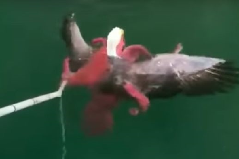 Sewaktu menyerang seekor sotong di dalam air, helang itu diserang semula sehingga hampir lemas.