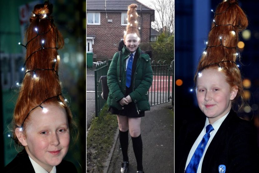 Poppy Leigh, 13, merasai sambutan Hari Krismas pada minggu terakhirnya di sekolah sebelum perayaan itu dengan menggayakan rambut seperti pokok Krismas.