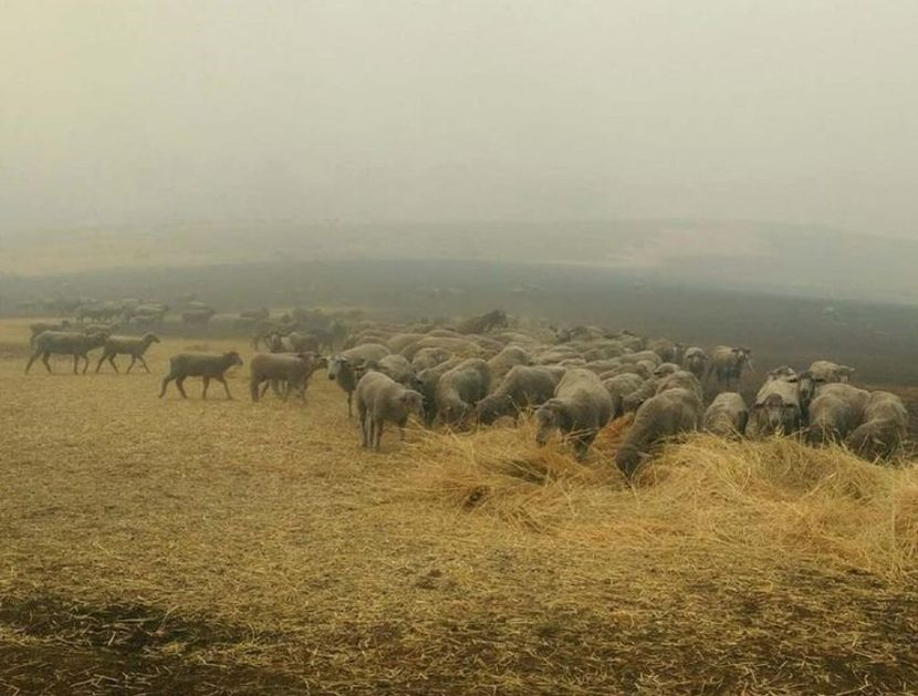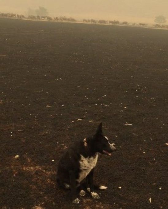 Cath Hill telah berkongsi gambar 'anjing bertuah' milik abangnya itu sedang duduk di tanah ladang yang terbakar berlatar belakangkan biri-biri yang diselamatkannya dan langit gelap dipenuhi asap.