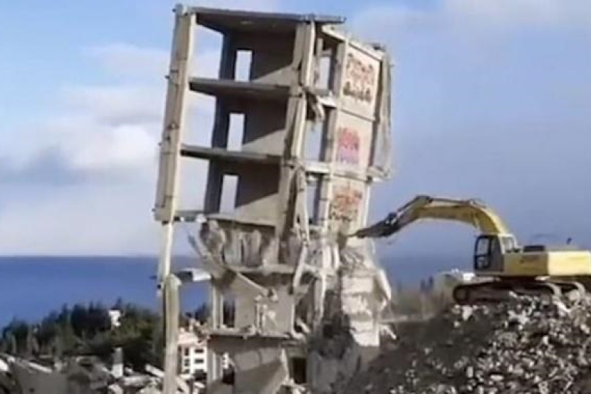 Dalam video itu, bangunan apartmen tersebut berhayun beberapa saat sebelum binaan konkritnya runtuh ke atas jentera itu.