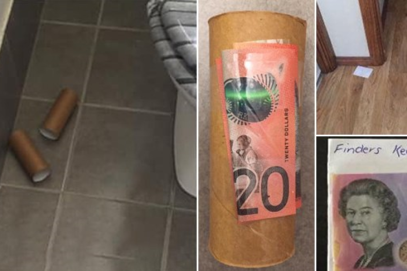 Wanita dari Australia itu menampal wang pada beberapa sampah di rumahnya berserta nota 'siapa jumpa dia punya'.