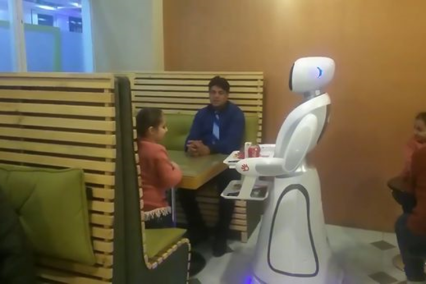 ROBOT pelayan yang direka seolah-olah kelihatan seperti wanita berhijab dirakam sedang melayan pelanggan sebuah restoran di Afghanistan.