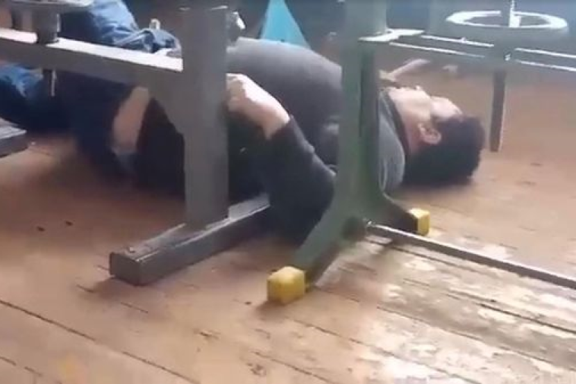 Menerusi video berdurasi seminit itu yang dipercayai dirakamkan oleh seorang pelajar menggunakan telefon bimbit, seorang lelaki duduk di atas meja sambil memegang batang kayu.