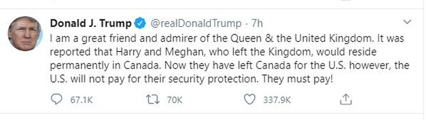 Trump menulis di Twitter: "Saya adalah kawan baik dan penyokong Ratu & United Kingdom. Laporan menyatakan Harry dan Meghan telah meninggalkan kerajaan dan akan menetap di Kanada.