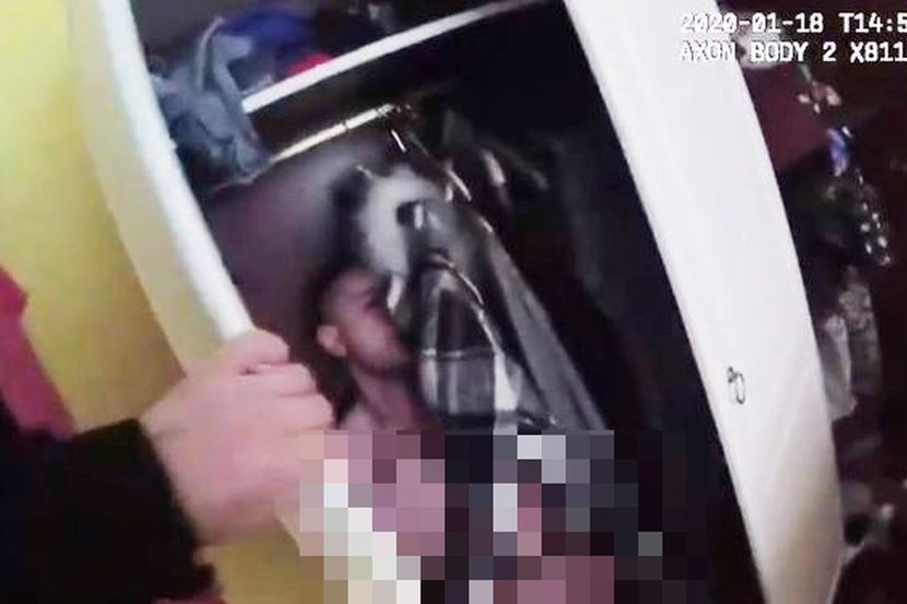 Menerusi rakaman kamera yang dipasang pada badan anggota polis, seorang pegawai menyuluh ke bawah katil di sebuah bilik, sebelum beralih ke sebuah almari.