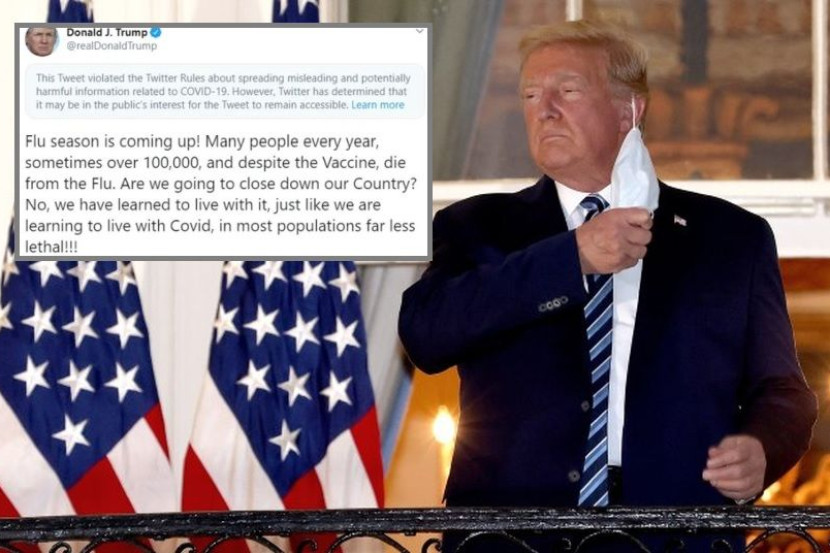 Trump menulis: "Musim selesema bakal hadir! Ramai orang pada setiap tahun, kadang kala melebihi 100,000 mati akhibat selesema walaupun ada vaksin. Apakah kita akan menutup negara kita? Tidak, kita perlu hadapinya sama seperti kita menghadapi Covid-19 di kebanyakan populasi yang jauh lebih membahayakan."