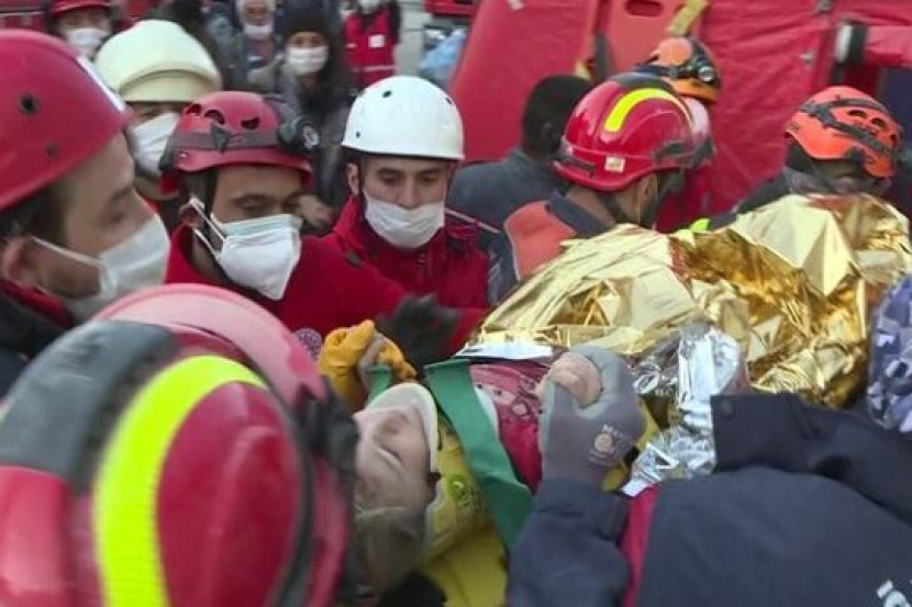 Rakaman video menunjukkan Elif diselamatkan Izmir, salah seorang petugas mencari dan menyelamat mangsa kejadian runtuhan akibat gempa bumi berukuran 7 magnitud yang menggegar Turki dan Greece.