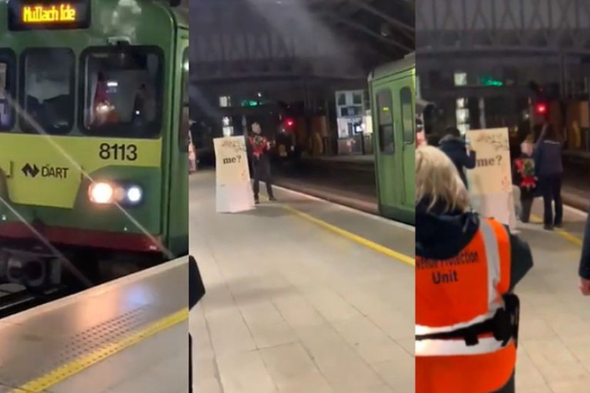 Menerusi satu rakaman video orang awam yang dikenali sebagai Clodagh Maher, kelihatan lelaki berkenaan berdiri di platform sambil memegang sepanduk bertulis 'Will you marry me?' bersama sejambak bunga yang besar.