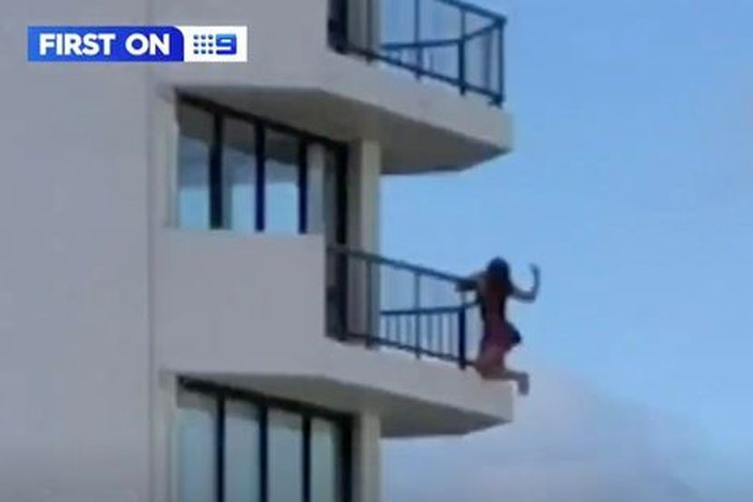 Video yang dikongsi oleh saluran berita Australia, 9News menunjukkan wanita berkenaan bergayut di balkoni di tingkat 11 Seaside Resort di Mooloolaba di Pantai Sunshine di Queensland.