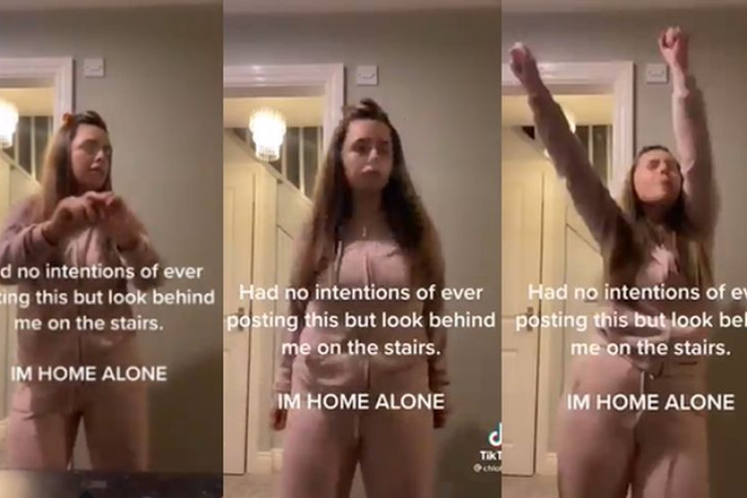 Chloe menulis: "Saya tiada niat untuk berkongsi rakaman ini, tapi cuba lihat apa yang berada di tangga di belakang saya. Saya sendirian di rumah."