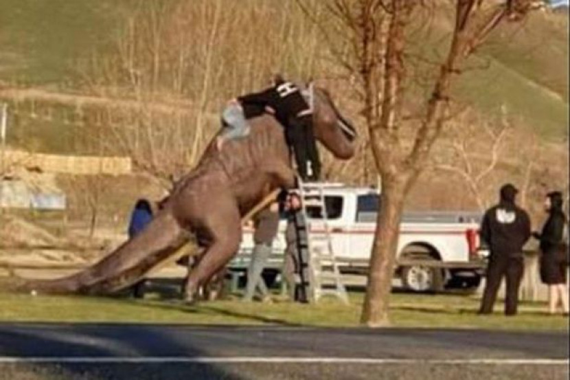MALANG menimpa wanita ini apabila dia terperangkap di atas sebuah patung dinosaur di Washington, Isnin lalu.