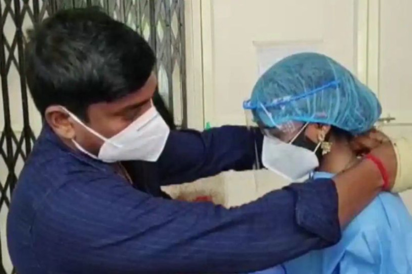 Menerusi foto yang yang tular di media sosial, kelihatan pengantin perempuan mengenakan sut lengkap kelengkapan perlindungan diri (PPE) sementara pasangannya mengenakan kemeja biru dan dhoti (persalinan tradisional) berwarna putih.