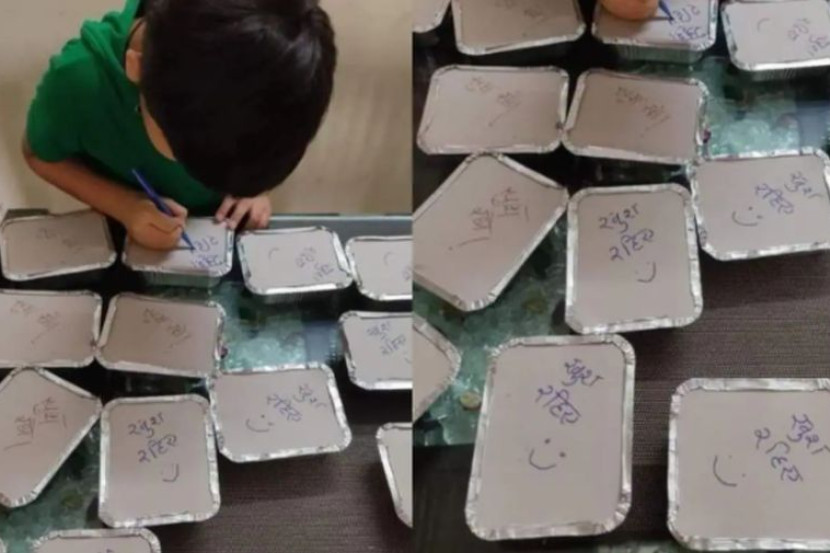 Menerusi foto yang tular, kelihatan kanak-kanak yang dikenali sebagai Aadvik Gautam dari daerah Bhopal Madhya Pradesh, India gigih menulis mesej positif berkenaan pada setiap kotak makanan.