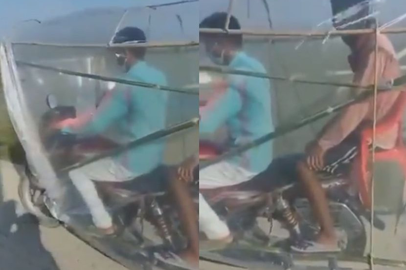 Dia yang menyediakan perkhidmatan pengangkutan, menggunakan plastik dan menutupi sekeliling motosikalnya dan diperkukuh dengan rod besi.