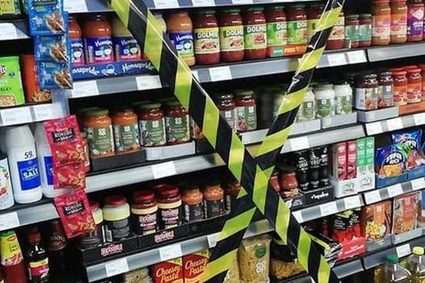 Imej tersebut menunjukkan rak yang menempatkan roti bawang putih, pasta dan produk makanan Itali lain ditutup dengan pita kuning dan hitam sebagai larangan.