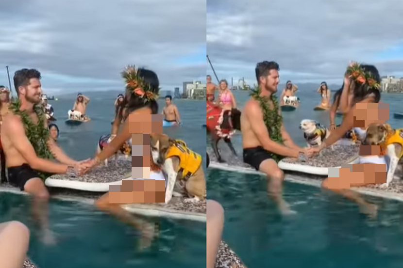 Menerusi klip video yang tular, kelihatan pasangan tersebut yang hanya mengenakan seluar pendek dan bikini meraikan hari bahagia mereka sambil disaksikan kaum keluarga dan rakan.
