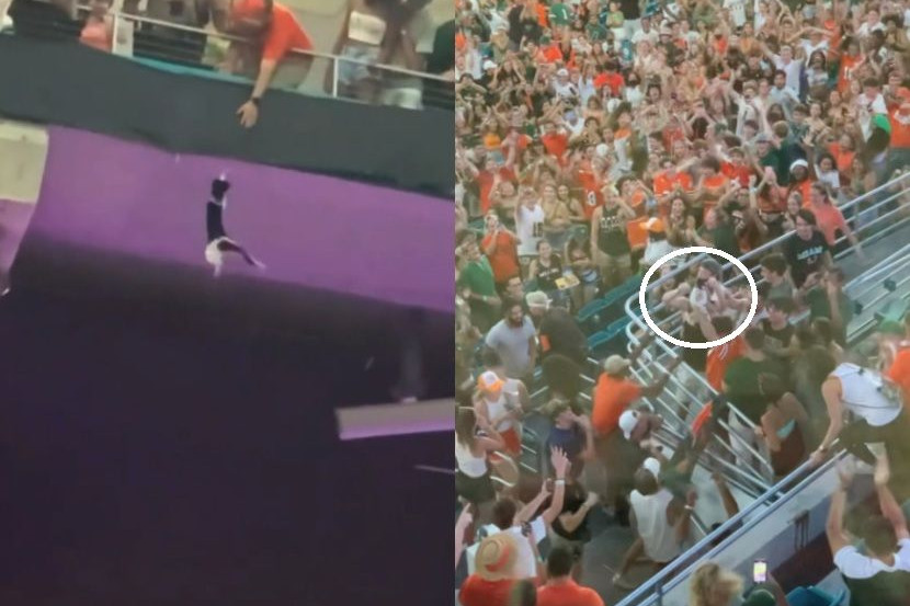 Rakaman daripada telefon bimbit penonton lain memaparkan saat cemas apabila kucing berkenaan hilang cengkaman sebelum jatuh ke arah penonton.